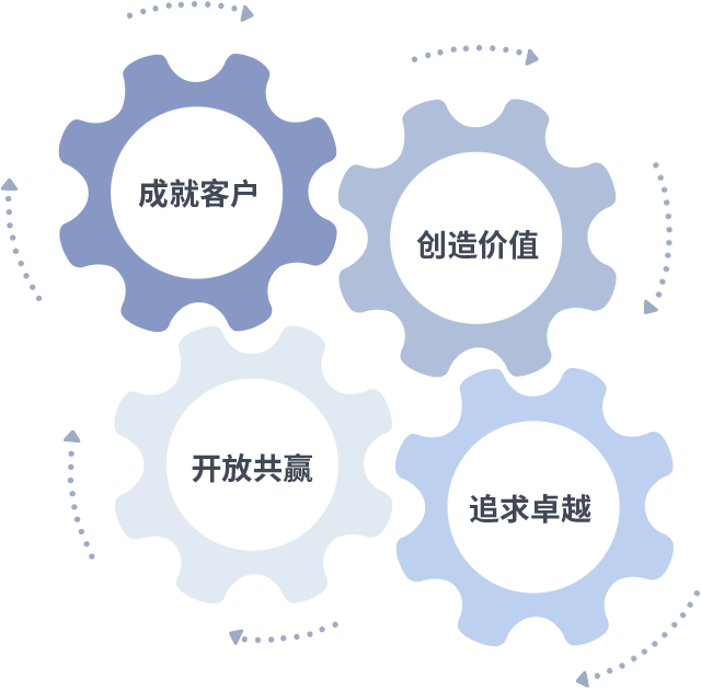 成就客户是一切决策的出发点,,,,创造价值是衡量所有工作的标准,,,,追求卓越是我们做事做人的态度,,,开放共赢是我们的格局也是最终的结果。。。价值观的齿轮环环相扣,,,,推动着组织里的每个人不断向前。。